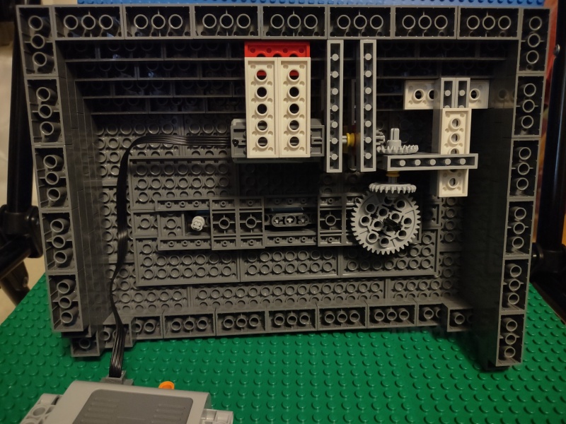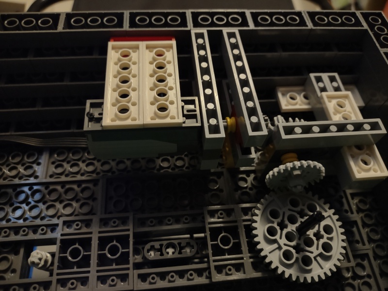 Utrymmet under mark räckte inte riktigt på höjden, så jag fick lägga till ett lager klossar (som jag inte hade, därav frånvaron av mur bakåt - ska fixas så småningom). "växellådan" kunde kanske vara lite snyggare, men den funkar.